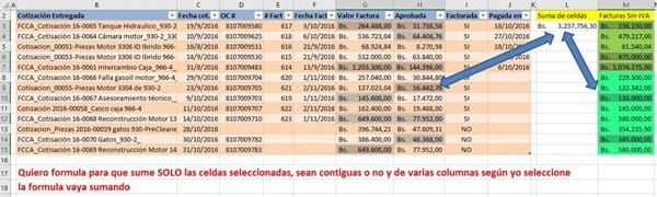 amig@s Tengo esta plantilla la cual quiero meterle una formukla para que me sume SOLO las celdas que yo seleccione, sean contiguas o no y de u en varias columnas