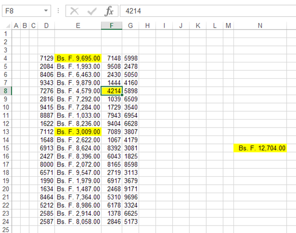 Como verás, sumó en N15 las que tienen formato Bs y no aquella que carece de ese formato. Desde luego, si hago click en cualquier otra celda en blanco (con o sin formato) limpia la celda N15.
