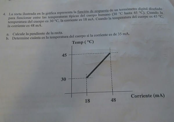 Calcular la pendiente de la recta y determinar la temperatura del cuerpo si la corriente es de 35 mA?