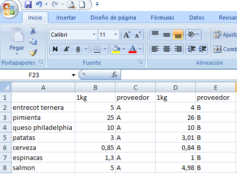 Yo tengo una tabla con los nombre de los productos arriba y en la fila de abajo los gramos utilizados por receta