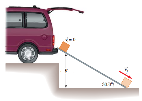 Una caja de 2.50Kg que se desliza hacia abajo por una rampa en un muelle de carga. La rampa mide 0.850 m de largo y está inclinada 30. 0o. La caja empieza desde el reposo en la parte superior y experimenta una fuerza de fricción constante, cuya magnitud es de 3.80 N y continua moviéndose una corta distancia sobre el suelo plano. A) Utilice métodos de energía para determinar la velocidad de la caja cuando alcanza el punto inferior de la rampa y B) ¿A qué distancia se desliza la caja sobre el piso horizontal si continua experimentando una fuerza de fricción de 4.50 N de magnitud?