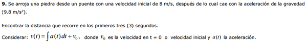 Hallar el siguiente ejercicioSe arroja una piedra desde un puente con una velocidad inicial de 8 m/s