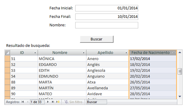 Dim consultaSQL as String consultaSQL = "SELECT * FROM ALUMNO" consultaSQL = consultaSQL & " WHERE fecha_nacimiento >= #" & txtFechaInicial.Value & "# AND fecha_nacimiento <= #" & txtFechaFinal.Value & "# "