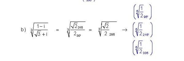 De este ejercicio no entiendo nada de nada. He intentado dividir lo que está dentro de la raíz (para buscar la parte real y la imaginaria del nº complejo) y no me da nada razonable. ¿Cómo llegan ellos a la solución que dan?