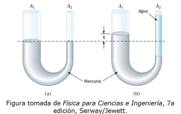 Se vertió mercurio en un tubo en U como se muestra en la figura(a). El brazo izquierdo del tubo tiene sección transversal A1 área de 10,0 cm², y el brazo derecho tiene un área de sección transversal A2 de 5,00 cm². Después se vierten 100 gramos de agua de mar en el brazo derecho como en la figura (b). A) Determinar la longitud de la columna de agua en el brazo derecho del tubo en U. B) Dado que la densidad del mercurio es 13,6 g/cm³, ¿qué distancia h sale el mercurio en el brazo izquierdo?