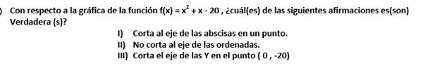 Matemáticas GATOPG . el 18 nov. 16 Tengo un problema de álgebra Seguir Siguiendo Dejar de seguir 1 Respuesta Respuesta de Luis Alberto Candio Salcedo 1 1 Luis Alberto Candio Salcedo, Profesor de Álgebra - Geometría - Trigonometría Como estas:I) Para saber si corta al eje de abscisas en un punto, se hace f(x) = y = 0Luego:x = - 5 x = 4FALSO (Corta al eje de abscisas en dos puntos) (- 5; 0) y (4; 0)II) No corta al eje de ordenadas. (FALSO)III) Para saber si corta al eje de ordenadas se hace x = 0. y = - 20 Luego: Corta al eje de coordenadas en el punto (0; - 20) VERDADERO el 18 nov. 16 - Anónimo ahora mismo Añadir comentario Usa los comentarios si quieres aportar algo a esta respuesta. No los utilices para preguntar algo nuevo. Cancelar Enviar