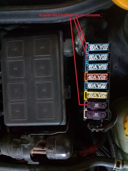 Resulta que de ido quitando todos y cada uno de los fusibles que tiene (también el compartimento de dentro del coche), y he encontrado a los "culpables" (que estos me llevaran a el componente o lo que sea que este haciendo el corto), no se si alguien sabe a que componentes corresponden estos fusibles (el coche es un opel astra g 1.7dti motor isuzu 75cv año 2001, dejo una foto, cuando quito esos 3 fusibles pasa de consumir 115A a consumir 0.1A . Saludos