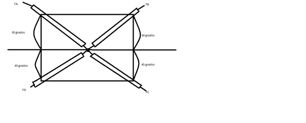 Los 4 elementos de madera que se muestran en la figura están unidos con una placa de metal y se encuentran en equilibrio sometidos a la acción de 4 fuerzas. Si FA: 2.3 KN Y FB: 2.1 KN, determine las magnitudes de las otras fuerza