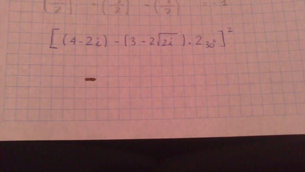 $$\begin{align}&[(4-2i)-(3-2 \sqrt 2 \ i)(2cos30º+2isen30º) \Big]^2=\\&\\&\Big[(4-2i)-(3- 2 \sqrt 2 \ i)( \sqrt 3+i) \Big]^2=\\&\\&\Big[(4-2i)-(3 \sqrt 3 +3i- 2 \sqrt 6 \ i- 2 \sqrt 2 \ i^2) \Big]^2=\\&\\&\Big[(4-3 \sqrt 3+ 2 \sqrt 2)+(2 \sqrt 6-5)i \Big]^2=\\&A^2+B^2+2AB\ \ \ Identidad \ notable\\&\\&A^2=(4-3 \sqrt 3+ 2 \sqrt 2)^2=\\&(a+b+c)^2=a^2+b^2+c^2+2ab+2ac+2bc\\&=16+27+8-24 \sqrt 3+16 \sqrt 2- 12 \sqrt 6\\&\\&B^2=(2 \sqrt 6 -5)^2i^2=(24-20 \sqrt 6+25)(-1)\\&\\&2AB=2(4-3 \sqrt 3+ 2 \sqrt 2)(2 \sqrt 6 -5)i=2i(8 \sqrt 6 -20-6 \sqrt{18}+15 \sqrt 3+4 \sqrt {12}-10 \sqrt 2)=\\&\\&2i(8 \sqrt 6 -20-18 \sqrt{2}+15 \sqrt 3+8 \sqrt {3}-10 \sqrt 2)=(16 \sqrt 6+46 \sqrt 3-36 \sqrt 2-40)i\\&\\&A^2+B^2+2AB=\\&16+27+8-24 \sqrt 3+16 \sqrt 2- 12 \sqrt 6-24+20 \sqrt 6-25+(16 \sqrt 6+46 \sqrt 3-36 \sqrt 2-40)i=\\&\\&\\&\end{align}$$solo falta agrupar los términos semejantes