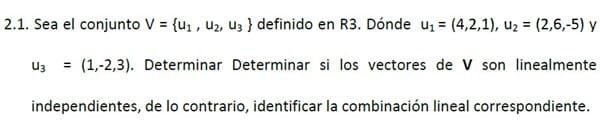 Determinar si los vectores de V son linealmente independientes, de lo contrario, identificar la combinación línea correspondient
