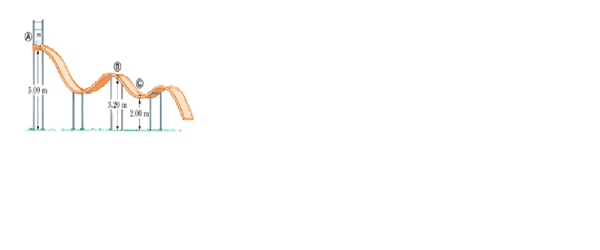 Considere la pista de tobogán mostrada en la figura. Los puntos marcados corresponden a: A = máximo absoluto, B = máximo local, C = mínimo local. Un bloque de hielo (masa en la figura) patina sobre la pista sin rozamiento apreciable. El bloque es apoyado sobre el punto C y se le imprime allí una rapidez, para lanzarlo hacia arriba por la pista. (a) ¿Cuál debe ser el valor de para que justo alcance a llegar al punto A? (Asumimos que el bloque no pierde nunca contacto con la pista). Para las preguntas (b), (c) y (d), el bloque es lanzado con la rapidez calculada en la pregunta (a). (b) Determine la rapidez con la cual pasa el bloque por el punto B. (c) Suponga que el radio de curvatura de la pista en el punto B vale 4.50 m. Determine la magnitud de la fuerza de contacto entre el bloque y la pista en ese punto. (d) ¿Cuál podría ser el valor mínimo del radio de curvatura de la pista en el punto B si se busca que el bloque se mantenga en contacto con ella al pasar por ese punto?