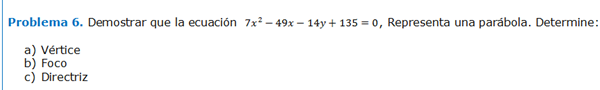 $$\begin{align}&7x^2-49x+14y+135=0\\&\\&7(x- \frac 7 2)^2- \frac{49} 4 7=-14y-135\\&\\&7(x- \frac 7 2)^2=-14y-135+\frac{343}4\\&\\&7(x- \frac 7 2)^2=-14y - \frac {197}4\\&\\&(x- \frac 7 2)^2=-2y- \frac{197}{28}\\&\\&(x- \frac 7 2)^2=-2(y+\frac {197}{56})\\&\\&parábola \ tipo:\\&(x-h)^2=4p(y-k)\\&p<0\\&4p=-2\\&p=-\frac 1 2\\&\\&parábola \ desplazada \ con \ eje \ vertical \ x= \frac 7 2=3.5\\&\\&V=(\frac 7 2, - \frac{197}{56})\\&directriz:\ \ y=-p-k=\frac 1 2- \frac{197}{56}=- \frac{169}{56}\\&\\&y=- \frac{169}{56}=-3.0179\\&\\&Foco:\\&(\frac 7 2 ,p-k)=(\frac 7 2, -\frac 1 2- \frac{197}{56})=( \frac 7 2,- \frac{225}{56})=(3.5,-4.0179)\\&\end{align}$$