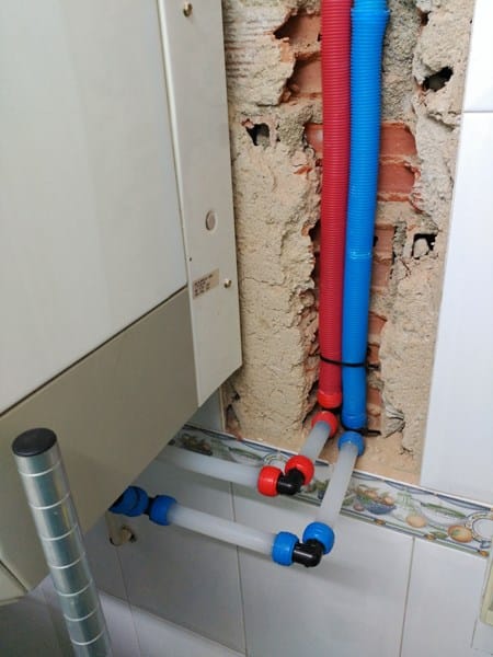 La instalación no esta mal, que quizás tu hubieses querido que saliese menos de la pared hasta estar más cerca de la caldera, podría ser, si se colocases un codo en la salida de la pared hacia abajo que quedase empotrado saldría más apegado a la pared y tendrías más espacio podrías colocar la rachola y si quieres poner una estantería podrías recortar un poco la madera para que pasase el tubo.