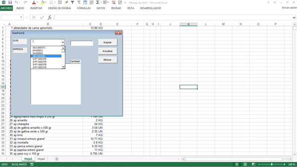 Private Sub UserForm_Activate() cnnProducto.Open "Provider=Microsoft.Jet.OLEDB.4.0;DATA SOURCE=D:\Base Datos Tienda (2).MDB" 'conexion con ubiacion archivo 'rstProducto.Open "SELECT IdProducto, NombreProducto, PrecioUnidad, UnidadesEnExistencia FROM Productos", cnnProducto, adOpenKeyset, adLockOptimistic, adCmdText rstProducto.Open "SELECT factura,nombre FROM Reg_Salidas", cnnProducto, adOpenKeyset, adLockOptimistic ', adCmdText Do Until rstProducto.EOF '= False ComboBox1.AddItem rstProducto.Fields(0).Value rstProducto.MoveNext Loop cnnProducto.Close ListBox1.ColumnCount = 3 ListBox1.ColumnWidths = "40;130;50" End Sub