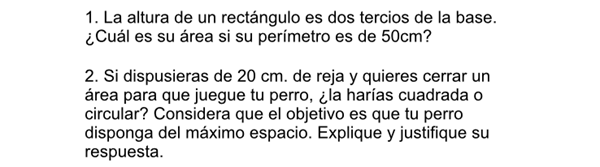 $$\begin{align}&1. \\&A = b \cdot h = b \cdot \frac{2}{3}b = \frac{2}3 b^2\\&P = 2b + 2h = 2b + 2\cdot \frac{2}3 b=2b+\frac{4}3b = \frac{10}3b = 50 \to b = \frac{50\cdot 3}{10}=15\\&\therefore \\&A = \frac{2}{3}15^2=\frac{2\cdot 225}{3} = 150\\&\\&2. \\&Cuadrado:\\&A=L^2\\&P = 4\cdot L \to 20 = 4L \to L = \frac{20}{4} = 5\\&A = 5^2 = 25\\&Circunferencia\\&A=\pi \cdot r^2\\&P = 2\cdot \pi\cdot r = \to 20 = 2\cdot \pi\cdot r \to r = \frac{20}{2\cdot \pi} = \frac{10}{\pi}\\&A = \pi \cdot \bigg(\frac{10}{\pi} \bigg)^2 = \frac{100}{\pi} \approx 31.83\\&\text{Por lo tanto conviene hacerla circular ya que el área es mayor}\end{align}$$Salu2