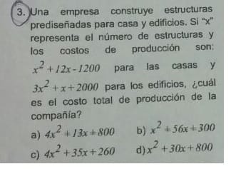 Matemáticas Anónimo el 27 nov. 16 4- Tengo un problema cuatro matemática Seguir Siguiendo Dejar de seguir 1 respuesta Respuesta de Luis Alberto Candio Salcedo 1 1 Luis Alberto Candio Salcedo, Profesor de Álgebra - Geometría - Trigonometría Como estas:De acuerdo a los datos brindados se tiene;Destruyendo paréntesis:Reduciendo términos semejantes:El costo total de producción de la compañía es: el 27 nov. 16 - Anónimo ahora mismo Añadir comentario Usa los comentarios si quieres aportar algo a esta respuesta. No los utilices para preguntar algo nuevo. Cancelar Enviar