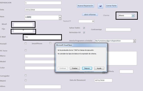 Tengo este formulario que se alimenta de la tabla "Taller". Me gustaría que al seleccionar el cliente en el combinado para buscar "Cliente", me autocompletara los campos de teléfono y mail.