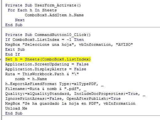 Generar pdf de hoja seleccionada en Combobox