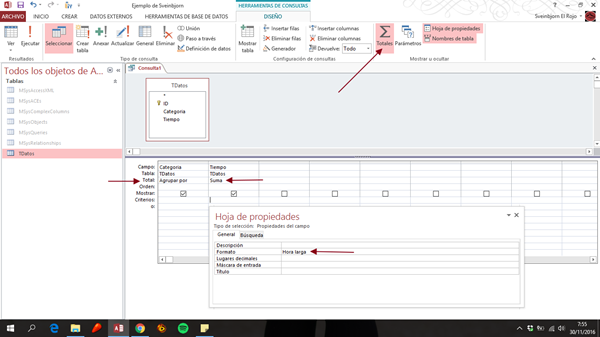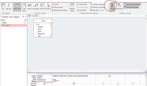Tengo una consulta obtenida a partir de dos tablas donde se registran categorías de observación de conductas y la duración de las mismas. En dicha consulta tengo un campo llamado [categoria] y otro llamado [duracion]. El primero es de tipo texto y el segundo me muestra la duración en horas, minutos y segundos. Mi problema es cómo conseguir que se me agrupen todas las categorías iguales y se sumen los tiempos relativos a las categorías iguales.