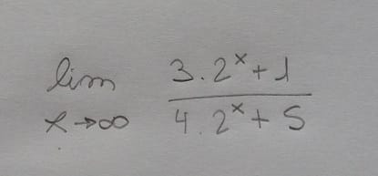 $$\begin{align}&\lim\limits_{x\to \infty}\left(\frac{(3)2^x+1}{(4)2^x+5}\right)=\lim\limits_{x\to \infty}\left(\frac{\frac{(3)2^x+1}{2^x}}{\frac{(4)2^x+5}{2^x}}\right)=\lim\limits_{x\to \infty}\left(\frac{\frac{(3)2^x}{2^x}+\frac{1}{2^x}}{\frac{(4)2^x}{2^x}+\frac{5}{2^x}}\right)=\lim\limits_{x\to \infty}\left(\frac{3+\frac{1}{2^x}}{4+\frac{5}{2^x}}\right)\end{align}$$