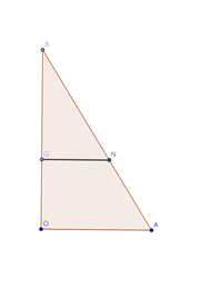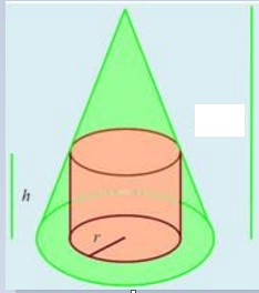 $$\begin{align}&\frac{SQ}{SO}=\frac{QN}{OA}\\&\\&\frac{h-H} h= \frac R r ===> r=\frac{hR}{h-H}\\&\\&V_{con}= \frac13 \pi r^2h= f(r,h)\\&\\&V(h)= \frac 1 3 \pi \Big(\frac{hR}{h-H} \Big)^2·h= \frac{\pi R^2}3· \frac{h^3}{(h-H)^2}\\&\\&V'(h)=\frac{\pi R^2}3 · \frac{3 h^2(h-H)^2-2(h-H)h^3}{(h-H)^4}=simplificando=\\&\\&\frac{\pi R^2}3 \frac{3h^2(h-H)-2h^3}{(h-H)^3}=\\&\\&\frac{\pi R^2}3·\frac{h^3-3h^2H}{(h-H)^3}===> V'(h)=0\\&\\&\\&\frac{\pi R^2}3·\frac{h^3-3h^2H}{(h-H)^3}=0===> h^3-3h^2H=0 ==>\\&\\&h^2(h-3H)=0 \\&\\&h-3H=0\\&\\&h= 3H\\&\\&r= \frac {hR}{h-H}=\frac{3HR}{2H}=\frac 3 2 R\\&\\&Comprobación \ mínimo (criterio \derivada \ primera)\\&V'(h=2H)= \frac 1 3 \pi R^2 \frac{(2H)^3-3(2H)^2H}{(2H-H)^3}= \frac{8H^3-12H^3}{H^3}<0 ==> decreciente \ a\ la \ izquierda\\&\\&V'(h=4H)= \frac 1 3 \pi R^2 \frac{(4H)^3-3(4H)^2H}{(2H-H)^3}= \frac{64H^3-48H^3}{H^3}>0==> \ creciente \ a\ la \ derecha\end{align}$$