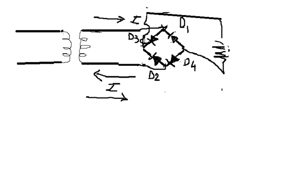 Empezamos suponiendo que el semiciclo positivo se genera en la parte superior de la bobina(por algún lado hay que empezar 8-), tomando mi criterio de que la corriente va de más a menos llegamos a la unión de los diodos D3 y D1, pero no puedes pasar por D1 pues te encuentras su cátodo, es decir, lo tienes inversamente polarizado, sin embargo sí puedes pasar por D3 pues tienes su ánodo a favor(directamente polarizado). Ahora estamos en el otro extremo de D3 y te pasa lo mismo con D2, no puedes atravesarlo pues tienes su cátodo primero, así que no te queda otro remedio que seguir por la resistencia. Pasas la resistencia y ahora te encuentras un dilema, te encuentras que puedes ir por D1 y D4 ya que tienes los ánodos a favor. Pero no hay dilema ninguno ya que tienes que tener siempre en mente(piensa como un electrón 8-) que los electrones siempre van a ir por el camino más corto(el que más les atrae) hasta el otro polo, por lo que tienes que seguir el camino por el diodo D4 que justamente ya llegas al otro extremo de la bobina cerrando así el circuito.
