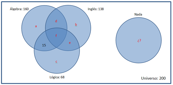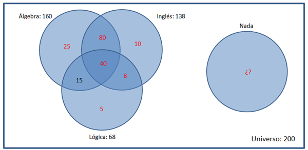 En una encuesta a 200 estudiantes unadistas se encontró que 68 habían tomado cursos de Lógica, 138 habían tomado cursos de Inglés y 160 cursos de Álgebra; 120, cursos de Inglés y de Álgebra; 20 cursos de Lógica pero no de Inglés; 13 cursos de Lógica pero no de Álgebra; 15 cursos de Lógica y de Álgebra pero no de Inglés. ¿Cuántos de los entrevistados no tomaron cursos de Lógica ni de Álgebra ni de Inglés?