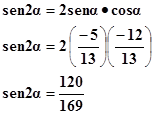 $$\begin{align}&\cos \ \alpha= - \frac{12}{13} \ \ y \ \ p(\alpha)\ esta \ en \ el \ tercer \ cuadrante \ cual \ es \ el \ valor \ de\ sen \ 2 \ \alpha \\\\&A) \ -\frac{120}{169} \\\\&B) \ -\frac{60}{169} \\\\&C) \ \ \ \ \frac{60}{169} \\\\&D) \ \ \ \ \frac{120}{169} \\\end{align}$$