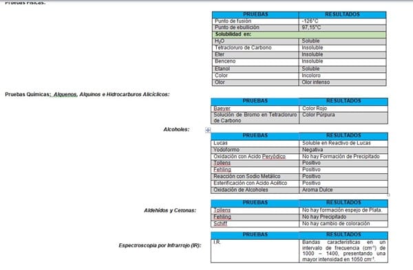 -¿Qué posible compuesto orgánico corresponde a los resultados de análisis de los parámetros Físicos, Químicos y espctroscópicos?