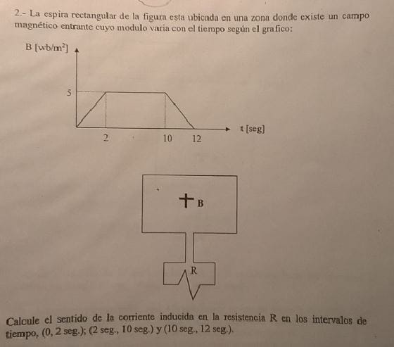 Entre 0 y 2 seg. Flujo B creciente... una corriente inducida I circulara en sentido del reloj recorriendo la espira. Inversamente entre 10 y 12 seg. La misma corriente I circulará en sentido contrareloj recorriendo la espira. Entre 2 y 10 seg. No habra corriente inducida circulante por R.