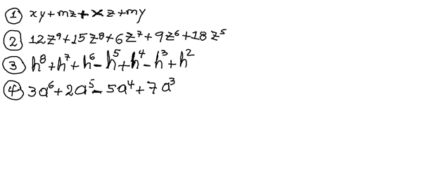 $$\begin{align}&1)\quad xy +mz +xz+my= x(y+z)+m(z+y)=(y+z)(x+m)\\&\\&\\&2)\text{ Tomamos el máximo común divisor de los números y las letras}\\&\text{El máximo común divisor de los números es 3, todos son múltiplos de 3,}\\&\text{pero de 6, 9 o mayores siempre hay alguna que no lo es}\\&\text{Y el máximo común divisor en la misma letra con diversos exponentes}\\&\text{es la letra elevada al menor de los exponentes }z^5\\&\\&12z^9+15z^8+6z^7+9z^6+18z^5=3z^5(4z^4+5z^3+2z^2+3z+6)\\&\\&3)\quad \text{Todos los coeficientes son 1 o -1 su MCD es 1}\\&h^8+h^7+h^6-h^5+h^4-h^3+h^2= h^2(h^6+h^5+h^4-h^3+h^2-h+1)\\&\\&4)\quad\text{Los coeficientes son primos entre si, el MCD es 1}\\&3a^6+2a^5-5a^4+7a^3 = a^3(3a^3+2a^2-5a+7)\end{align}$$