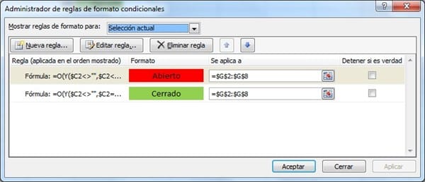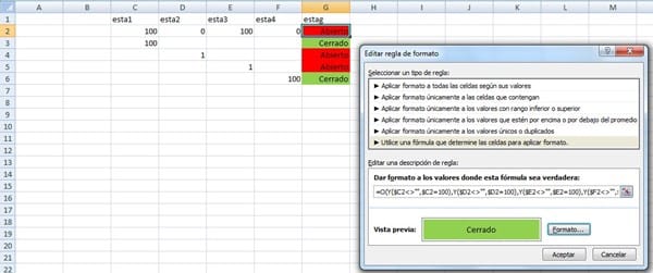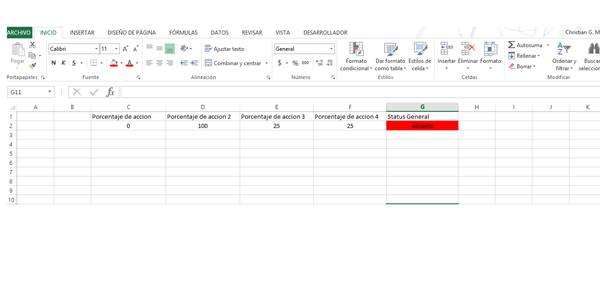 Tengo 4 columnas Porcentaje de acción 1, 2, 3 y 4, SI el porcentaje de acción de cada columna es 100% la casilla de Estatus general se pintara de verde con la leyenda de "Cerrado", en caso contrario como se muestra en la imagen, los 4 porcentajes no están al 100% y por eso el estatus dice "abierto" pintado de rojo, la cuestión aquí, es que aveces solo habrá un porcentaje para llenar, otras veces llenare dos, otras 3 y en otros casos los cuatro porcentajes. En dado caso que solo coloque un porcentaje que no sea el 100, el estatus marque "abierto" y si el porcentaje es 100% el estatus cambie a cerrado. De la misma manera cuando llene 2 porcentajes, si los dos estan al 100% marque cerrado, si no, abierto, igual con 3 porcentajes y con cuatro.