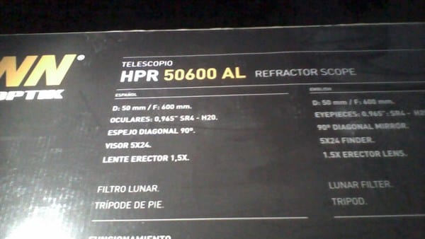 Es el HPR50600 AL, tiene 50 mm de diámetro y 600 mm de distancia focal (50/600), quisiera saber si puedo ver planetas, tiene un espejo diagonal de 90°.