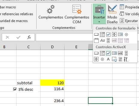 Estoy creando una plantilla de facturación a medida de mis necesidades en Excel. He aprendido de cero el programa en estos días ya que nunca lo había usado. Sólo me falta un detalle, necesito que en una ceda (debajo del sub total) pueda poner un botón (había pensado en una casilla de verificación) para que cuando la pulse se aplique un 3% de descuento sobre el sub total y se reste. La misma función con un impuesto llamado Recargo de Equivalencia el cual dependiendo del cliente es aplicado o no, por lo que en resumen necesito que al pulsar un botón opere ese porcentaje en la celda.