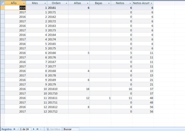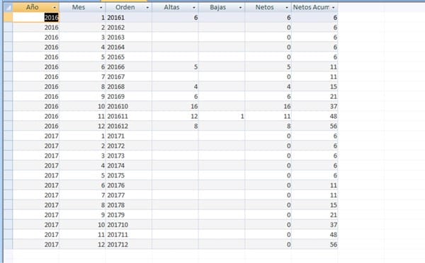 SELECT Year([Fecha Alta]) AS Año, Month([Fecha Alta]) AS Mes, Count(Tabla_Clientes.[Fecha alta]) AS Altas, Count(Tabla_Clientes.[Fecha baja]) AS Bajas, [Altas]-[Bajas] AS Neto
