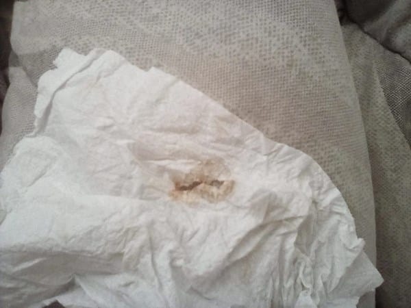 Aquí adjunto una imagen del trozo de papel higiénico donde pueden apreciar la ligera mancha de sangre . Espero me puedan ayudar gracias a todos de antemano