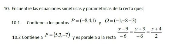 $$\begin{align}&\ paramétricas\\&\\&x=x_0+tv_1\\&y=y_0+tv_2\\&z=z_0+tv_3\\&\\&simétricas\\&\frac{x-x_0}{v_1}=\frac{y-y_0}{v_2}=\frac{z-z_0}{v_3}\\&\\&Donde\\&P(x_0,y_0,z_0)\\& \vec{v}=(v_1,v_2,v_3)\\&\end{align}$$10.1