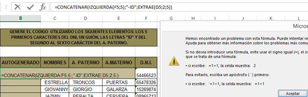 Pregunta:genere un còdigo .Los 5 primeros caracteres del DNI, un guion, las letras"ID", y del segundo al sexto carecter del apellido paterno .EN EXCEL 2013.