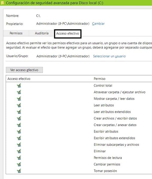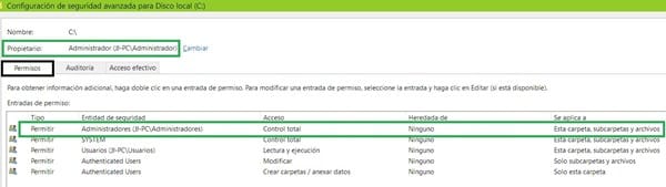 Como digo en el enunciado, en todo momento me está pidiendo permisos y el caso es que tengo la cuenta como administrador. Miro en configuración de seguridad avanzada y los administradores tienen permisos y control total en carpetas, subcarpetas y archivos.