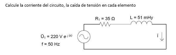 Las caidas sobre cada elemento las resolverias...Sobre R= 35 ohms ............V(R)= (5.717 x 35) / 65.4° = 200/65.4° volts........ Obviamente..en fase con LA CORRIENTE.