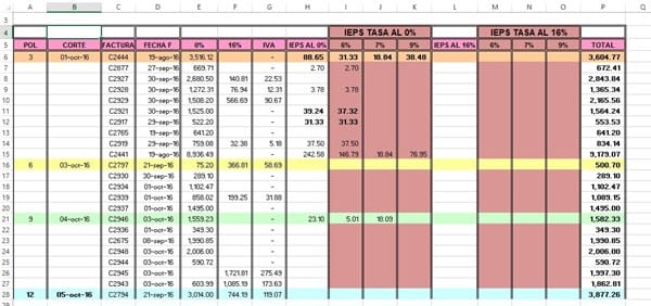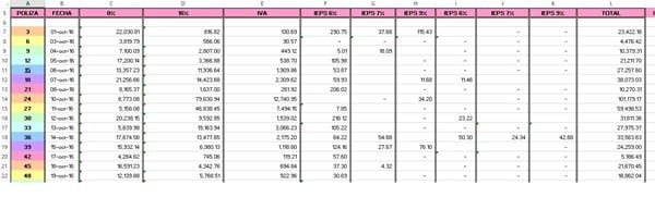 Tengo la tabla anterior de datos en excel, como se puede observar tengo una columna llamada POL (con varias FACTURAS, éstas son cambiantes por ejemplo la 3 para éste mes puede tener 11 o 12 facturas), y necesito un macro que sume los totales de la columna 0%, 16%, IVA, ..., TOTAL", y que éstos se peguen en la hoja siguiente hoja de la siguiente manera