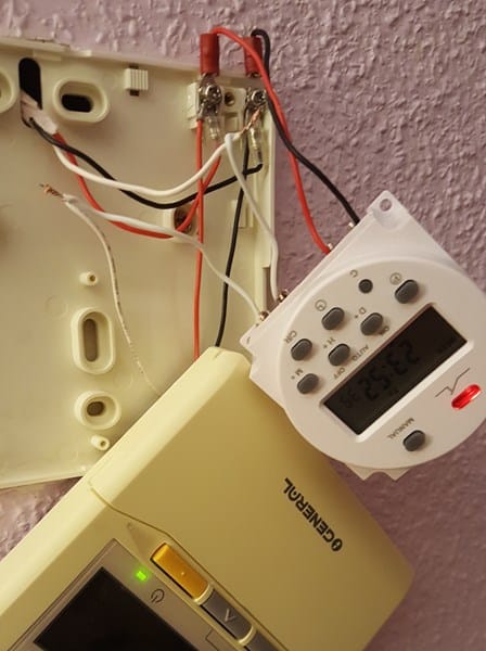 Entonces, tendrías que sacar un cable rojo y conectarlo a una de las tomas swicht y el otro terminal lo unes con el cable blanco que sale del programador viejo y con el cable blanco que va hacia el aparato