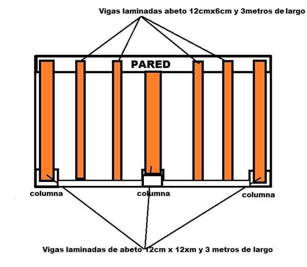 Estoy haciendo una ampliación en una casa de 3,7metros de largo por 2,80 de ancho, esta hecho en ladrillo con tres columnas en una de las paredes en las que apoyan dos viguetas de hormigón de 12cm durante los 3,7 metros de largo de la pared. Mi idea para el techo era poner unas vigas de madera laminada de 12x12 y de 3 metros de largo, metidas en la pared alta de ladrillo y apoyadas en las columnas que os pongo en los dibujos, y luego poner cuatro vigas más de madera laminada de 12x6 y de 3 metros de largo, entradas igualmente en pared y apoyadas en las viguetas de hormigón. Encima voy a poner un friso de pino visto de dos centímetros, luego aislante con sus trastreles, conglomerado de 1 centímetro y finalmente una lamina impermeabilizante y luego una placa de teja de plástico de esas que venden en leroy y demás de 2 metros por 1. Por lo tanto será un tejado ligero. Mi pregunta es si esas vigas son suficientes para suportar dicha carga. Mil gracias.