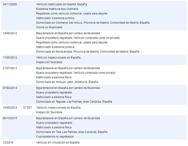 El vehículo ha tenido 4 propietarios hasta ahora. Los dos primeros han sido empresas de alquiler, e inexplicablemente no existe registro de kilometraje del vehículo en su primera ITV. Además en su segunda ITV (2014) ha dado una cifra de 38.000Km (muy pocos kilómetros para haber estado rodando desde 2009 y en empresas de alquiler. ¿No?).
