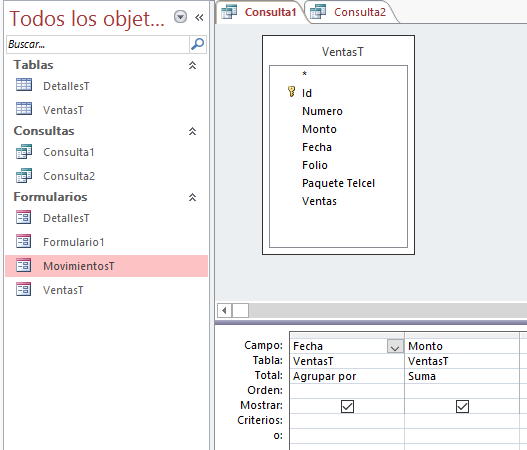 1º/ Crea una consulta de totales sobre la tabla VentasT, con los campos Monto (agrupado en Suma) y el campo Fecha