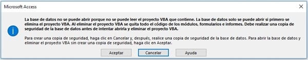 Microsoft Access, me avisa que debo eliminar el proyecto VBA para continuar