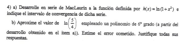 $$\begin{align}&P(x)=f(0)+f'(0)+ \frac{f''(0)}{2!}x^2+\frac{f'''(0)}{3!}x^3+····+\frac{f^{(n)}(0)}{n!}+E_n\\&\\&derivadas:\\&f(x)=ln(1+x^2) ==> f(0)=0\\&\\&f'(x)= \frac{2x}{1+x^2}==>f'(0)=0\\&\\&f''(x)= \frac{2-2x^2}{(1+x^2)}==> f''(0)=2\\&\\&f'''(x)= \frac{4x^3-12x^2}{(1+x^2)^3}==> f'''(0)=0\\&\\&f^{(4)}(x)=\frac{-12x^4+72x^2-12}{(x^2+1)^4}==> f^{(4)}(0)=-12\\&\\&f^{(5)}(x)= \frac{48x^5-480x^3+240x}{(1+x^2)^6}==>f^{(5)}(0)=0\\&\\&f^{(6)}(x)= \frac{ -240x^6+3600x^4-3600x^2+240}{(1+x^2)^6}==> f^{(6)}(0)=240\\&\\&\\&P(x)=f(0)+f'(0)+ \frac{f''(0)}{2!}x^2+\frac{f'''(0)}{3!}x^3+····=\\&\\&0+0+ \frac 2 {2!}x^2+0- \frac {12}{4!} x^4+0+ \frac{240}{6!}x^6+·····=\\&\\&x^2- \frac 1 2 x^4+ \frac 1 3x^6+·········= \sum _{n=1}^{ +\infty}\frac{x^{2n}} n· (-1)^{n+1}\\&\\&===>\\&a_n=\frac{(-1)^{n+1}} n\\&\\&\\&Criterio \de \Cauchy\\&\\&\lim_{n \to \infty} \frac{|a_{n+1}|}{|a_n|}=\lim_{n \to \infty} \frac{|\frac{(-1)^{n +2}}{n+1}|}{|\frac{(-1)^{n+1}}n|}=\lim_{n \to \infty} \frac{n}{n+1}=1=A\\&\\&Radio \convergencia= \frac 1 A=1\\&\\&intervalo \ convergencia:(-1,1)\\&\\&b)\\&ln( \frac 5 4)=ln(1+(\frac 1 2)^2)\\&\\&P( \frac 1 2)=(\frac 1 2)^2- \frac 1 2 (\frac 1 2)^4+ \frac 1 3 (\frac 1 2)^6+ E_7= \frac {43}{192}+E_7\\&\\&Error absoluto= \bigg| ln( \frac 5 4 )- \frac {43}{192} \Bigg|=8.147820191·10^{-4}\\&\\&Errorº Relativo=\frac {8.147820191·10^{-4}}{ln \frac 5 4}·100=0.3651 \ \%\\&\end{align}$$