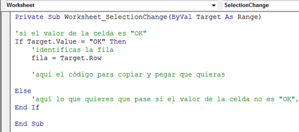 Quiero iniciar una macro que identifque l Fila en na célula activa, y dependiendo de su valor = "OK " inicie la copia de e valores de otro archivos a posiciones concretas de la mima fila