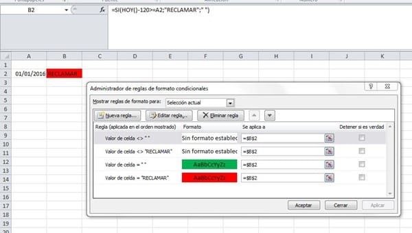 En una celda (A2) pongo una fecha y si pasan 120 días y no me han entregado la mercancía, me gustaría que me avisara poniéndose en rojo la celda siguiente (B2), y cuando me la entregan, poner en la celda roja la fecha de entrega y que desaparezca el color rojo y se quede fondo blanco con la fecha de entrega. También si es posible que durante los 119 días antes de cumplir los 120 la celda permanezca en verde... Tengo Excel 2013