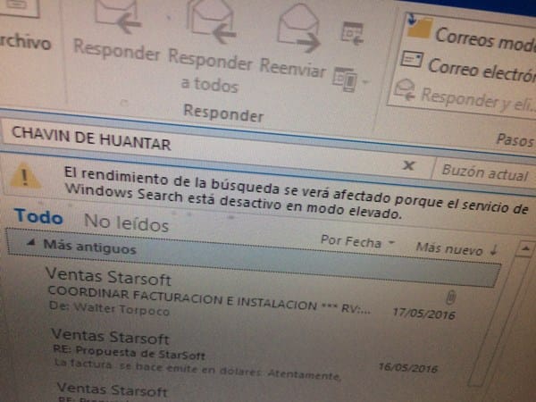 ¿Por qué me aparece al buscar correos en el Outlook 2016 que Windows Search este desactivo en modo elevado?